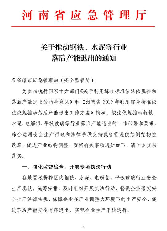日前,河南印發(fā)《關(guān)于推動鋼鐵、水泥等行業(yè)落后產(chǎn)能退出的通知》。全文如下: