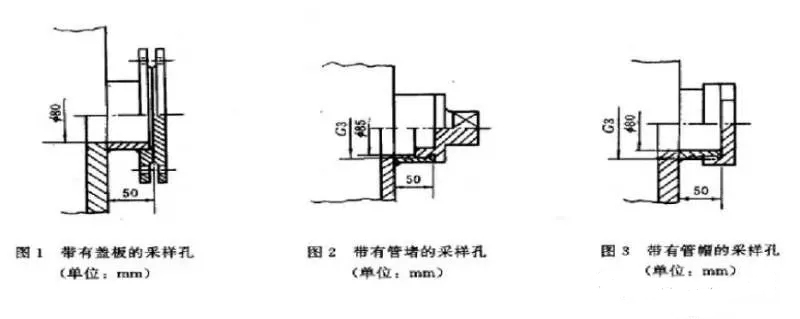 在選定的測(cè)定位置上開設(shè)采樣孔,采樣孔的內(nèi)徑應(yīng)不小于80mm,采樣孔管長(zhǎng)應(yīng)不大于50mm。不使用時(shí)應(yīng)用蓋板、管堵或管帽封閉(如下圖所示)。當(dāng)采樣孔僅用于采集氣態(tài)污染物時(shí),其內(nèi)徑應(yīng)不小于40mm。