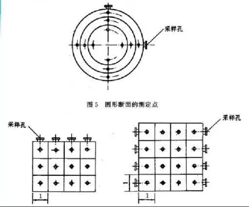 對(duì)圓形煙道,采樣孔應(yīng)設(shè)在包括各測(cè)點(diǎn)在內(nèi)的相互垂直的直徑線上(如下圖所示)。對(duì)矩形或方形煙道,采樣孔應(yīng)設(shè)在包括各測(cè)點(diǎn)在內(nèi)的延長(zhǎng)線上(如下圖所示)。