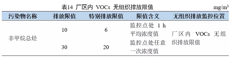 本標(biāo)準(zhǔn)規(guī)定了 VOCs物料儲(chǔ)存無(wú)組織排放控制要求、VOCs物料轉(zhuǎn)移和輸送無(wú)組織排放控制要求、工藝過程 VOCs無(wú)組織排放控制要求、設(shè)備與管線組件 VOCs 泄漏控制要求、敞開液面 VOCs無(wú)組織排放控制要求,以及VOCs無(wú)組織排放廢氣收集處理系統(tǒng)要求、企業(yè)廠區(qū)內(nèi)及周邊污染監(jiān)控要求。標(biāo)準(zhǔn)適用于涉及 VOCs無(wú)組織排放的現(xiàn)有企業(yè)或生產(chǎn)設(shè)施的 VOCs無(wú)組織排放管理,以及涉及VOCs無(wú)組織排放的建設(shè)項(xiàng)目的環(huán)境影響評(píng)價(jià)、環(huán)境保護(hù)設(shè)施設(shè)計(jì)、竣工環(huán)境保護(hù)驗(yàn)收、排污許可證核發(fā)及其投產(chǎn)后的 VOCs無(wú)組織排放管理。標(biāo)準(zhǔn)主要對(duì)無(wú)組織管控提出要求,在限值方面,強(qiáng)調(diào)了廠區(qū)內(nèi) VOCs 無(wú)組織排放的限值要求,見下表。該標(biāo)準(zhǔn)已于 2020 年 7 月 1 日起全面實(shí)施。