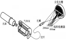 光源發(fā)出的紫外光通過光纖傳輸到測量室,測量室樣氣在特定波段吸收紫外光譜能量,被吸收后的光束通過光纖傳輸到光譜儀,在光譜儀內部經過光柵分光,由二極管陣列檢測器將分光后的光信號轉換為電信號,獲得氣體的連續(xù)吸收光譜信息,最后根據特定算法計算待測氣體濃度。其結構示意圖如下: