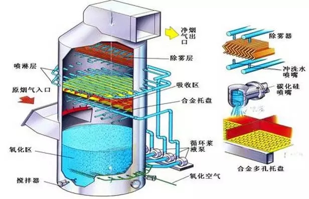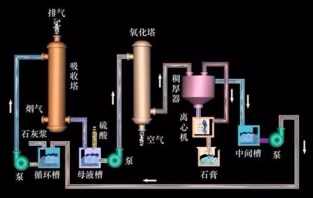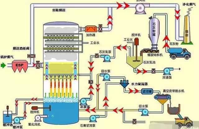 石灰石(石灰)石膏脫硫系統(tǒng)包括煙氣換熱系統(tǒng)、吸收塔脫硫系統(tǒng)、脫硫漿液制備系統(tǒng)、亞硫酸鈣氧化系統(tǒng)、石膏脫水系統(tǒng)等幾部分;該工藝是目前世界上最成熟應用最廣泛的技術。