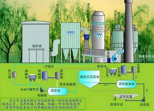 由于在吸收和吸收液處理中,使用了兩種不同類型的堿,故稱為雙堿法。雙堿法包括了鈉鈣、鎂鈣、鈣鈣等各種不同的雙堿工藝。鈉鈣雙堿法是較為常用的脫硫方法之一,成功應用于電站和工業(yè)鍋爐。
