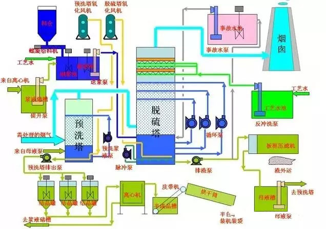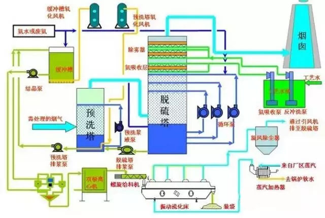 該工藝主要由脫硫洗滌系統(tǒng)、濃縮系統(tǒng)、煙氣系統(tǒng)、氨貯存系統(tǒng)、硫酸銨生產系統(tǒng)(若非氨-硫銨法則是于其工藝相對應的副產物制造系統(tǒng))、電氣自動控制系統(tǒng)等組成。