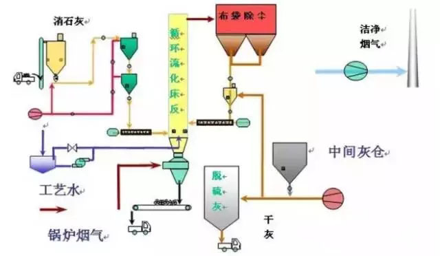 脫硫反應后的產物以干態(tài)粉末形式從分離器中吹出。這種脫硫技術應用石灰石或消石灰做脫硫劑。具有很高的脫硫率及脫硫劑利用率,而且對環(huán)境的影響很小。