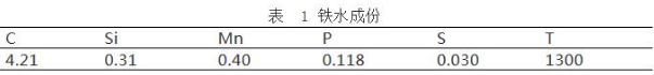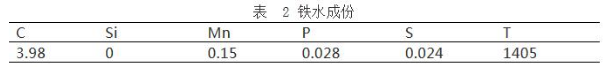 前期渣中加入石灰3 噸,輕燒 3 噸,冷料 3.5 噸,在吹煉到 1800 氧后起槍倒渣,此時(shí)的轉(zhuǎn)爐內(nèi)鐵水溫度為 1405 度,成份如下表: