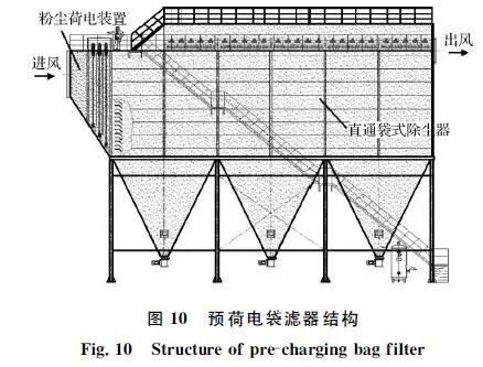 針對轉(zhuǎn)爐二次煙氣的排放特征,中鋼集團天澄環(huán)??萍脊煞萦邢薰鹃_發(fā)了預(yù)荷電袋濾器除塵技術(shù),將預(yù)荷電和直通式袋式除塵器復(fù)合形成一體化裝置,如圖10所示。粉塵預(yù)荷電后在濾袋表面將形成海綿狀粉餅結(jié)構(gòu),能提高凈化效率,同時降低運行阻力。中鋼天澄在鞍鋼煉鋼總廠2×180t轉(zhuǎn)爐二次煙氣凈化項目中建成示范工程,處理風(fēng)量2×60萬m3/h。2014年12月正式投運,截止目前持續(xù)穩(wěn)定,運行可靠,顆粒物排放質(zhì)量濃度低于10mg/m3,技術(shù)性能指標(biāo)達(dá)到超低排放,運行阻力為700~1 000Pa,低于傳統(tǒng)袋式除塵器。目前,在日照鋼鐵、新余鋼鐵、正大特鋼、唐鋼青龍、柳鋼等得到推廣應(yīng)用。