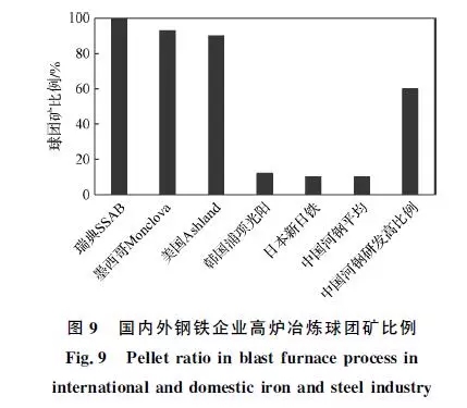 噸球團礦的SO2和NOx排放量僅為燒結(jié)礦的約1/2和1/3,提高高爐入爐原料中球團礦比例,有利于實現(xiàn)鋼鐵行業(yè)硫硝源頭減排。目前,國內(nèi)外鋼鐵企業(yè)高爐冶煉球團礦比例如圖9所示。歐美國家的高爐球團礦比例普遍在90%以上,瑞典SSAB廠為100%全球團冶煉,墨西哥Monclova廠為93%,美國Ashland廠為90%。亞洲國家高爐球團礦占比普遍較低:韓國浦項光陽廠為12%,日本新日鐵為10%,中國河鋼集團平均為10%,主要是因為球團礦的堿度較低(堿度為0.1~0.2)。