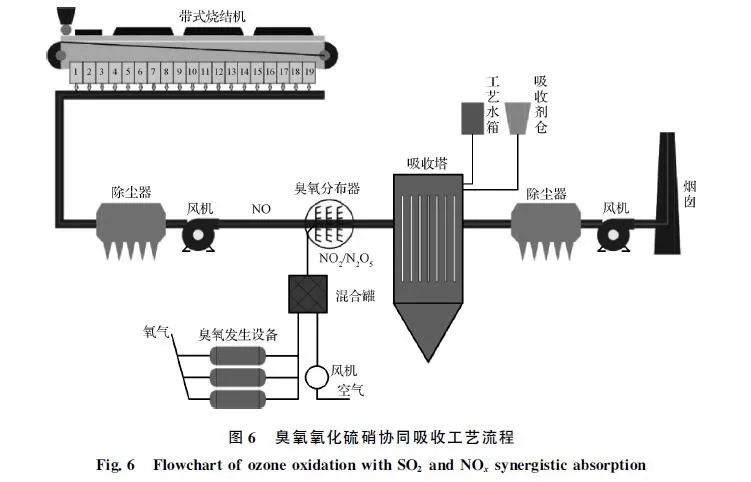臭氧氧化硫硝協(xié)同吸收技術(shù)系統(tǒng)簡單,占地面積小,該技術(shù)適用于煙氣溫度較低的燒結(jié)機,在實現(xiàn)排放指標(biāo)的同時,可減少投資和運行費用。通過臭氧的氧化作用,不易被吸收劑吸收的NO在煙道中被氧化為高價態(tài)NOx,可與SO2一起在后續(xù)脫硫塔中同時被吸收,不需再配置獨立的脫硝裝置,同時不存在SO3無法脫除的問題。