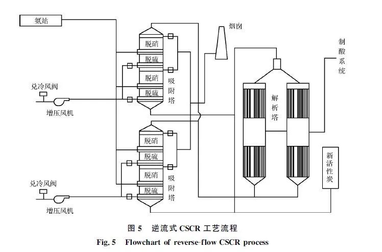 河鋼邯鋼在國內(nèi)率先選用了逆流式活性炭選擇性催化還原(CSCR)凈化燒結(jié)煙氣工藝,工藝流程如圖5所示。SO2通過活性炭的吸附-解析,再經(jīng)過催化氧化制成濃硫酸,實現(xiàn)了資源回收利用。通過脫硫段后,在上升的煙氣中進(jìn)行噴氨,進(jìn)入脫硝段后在活性炭的催化作用下NOx轉(zhuǎn)化為N2和水進(jìn)行脫硝。2018年2月邯鋼西區(qū)燒結(jié)機投運了逆流式CSCR工藝,實現(xiàn)長周期穩(wěn)定運行和較高的煙氣凈化效率,2018年上半年原始煙氣顆粒物質(zhì)量濃度為50~130mg/m3,SO2質(zhì)量濃度為750~900mg/m3,NOx質(zhì)量濃度為300~400mg/m3,凈化后煙囪NOx排放質(zhì)量濃度低于50mg/m3,SO2排放質(zhì)量濃度低于10mg/m3,固體顆粒物排放質(zhì)量濃度低于15mg/m3。