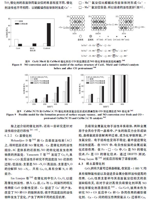 在CeTi 催化劑中,Ce 和Ti 在原子級別上的相互作用產生的Ce - O - Ti 有助于提高催化劑活性。Li Ping 等[75]用FETEM 直接觀察到Ce - O - Ti 結構,無定型Ce0. 3 TiO∞在( 175 ~ 400) ℃ 時的NO 轉化率為90%。此外,利用XANES 和原位FTIR 等證明了表面高度分散的Ce - O - Ti 結構是反應的活性中心。Chen Lei 等 利用溶膠- 凝膠法合成CuCeTi 催化劑,在( 150 ~ 250) ℃時的NO 轉化率大于80%,Cu 提供的L 酸位點成為反應的活性中心,加速了低溫段快速SCR 反應過程。在此基礎上進行改進( 圖5) ,在Ce - Ti 催化劑中摻雜了少量Cu2 + ,可以顯著提高催化劑的低溫SCR 活性。研究表明,Cu 與Ce 物質的量比0. 005 時,( 200 ~400) ℃的NO 轉化率為80%,N2選擇性為100%。Cu - O - Ce 的形成促進了Ce4 + 向Ce3 + 的轉化,增加了表面活性氧。分散態(tài)Cu 增加了Ce -Ti 催化劑表面酸性,提高了NH3吸附能力,從而加速了反應向E - R 機理方向進行。在Ce - Ti 催化劑中摻雜W 可以在Ce - W 間產生強烈的相互作用,產生更多的Ce3 +、NOx 和NH3吸附物種,從而提高催化劑活性。Fu Mengfan 等發(fā)現,采用共浸漬法時,在( 200 ~ 400) ℃ 的NO 轉化率大于90%。利用均相沉淀法進一步提高了Ce -W - Ti 催化劑在高空速下的活性,在Ce 與W 物質的量比1∶ 1、空速500 000 h - 1和溫度( 275 ~ 400) ℃條件下,NO 轉化率為90%。W 的引入促進了活性Ce 的分散,增加了催化劑表面活性CeO2晶體、氧空位和酸位。在低溫段( < 300 ℃) ,W 促進了NO 向NO2的氧化,在高溫段( > 300 ℃) ,W 提高了N2選擇性。