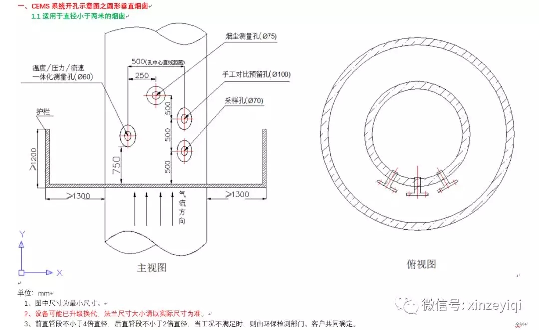 一、 煙氣在線監(jiān)測(cè)設(shè)備開(kāi)孔示意圖之圓形垂直煙囪