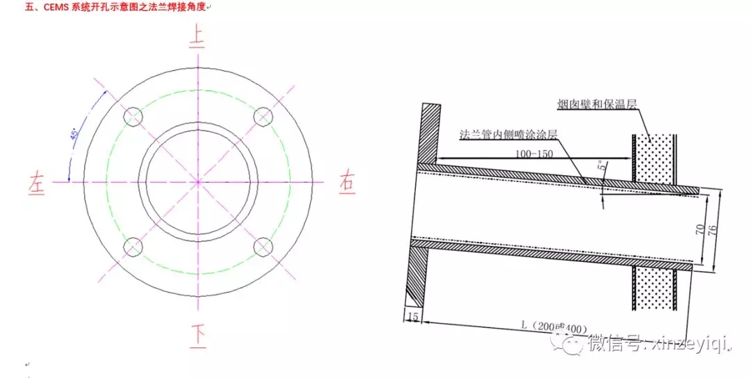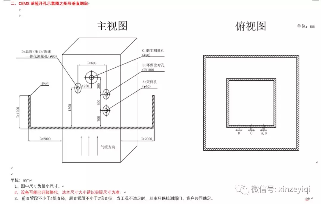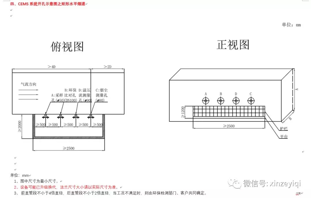 注意:開(kāi)孔位置及法蘭之間的距離尺寸可以按照開(kāi)孔示意圖來(lái)開(kāi)孔施工,開(kāi)孔的大小要根據(jù)煙氣在線監(jiān)測(cè)設(shè)備生產(chǎn)廠家的實(shí)際法蘭大小以及盲管直徑的粗細(xì)來(lái)施工。